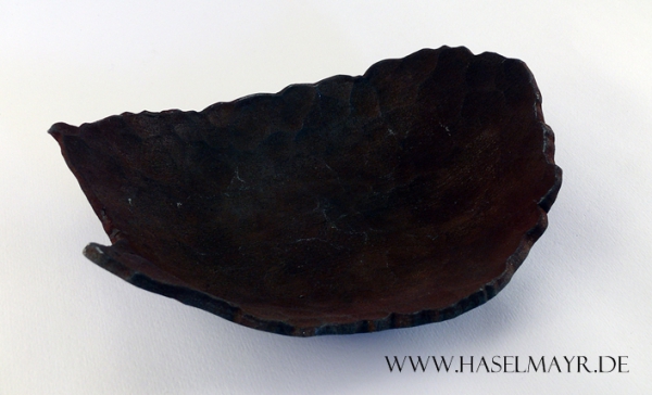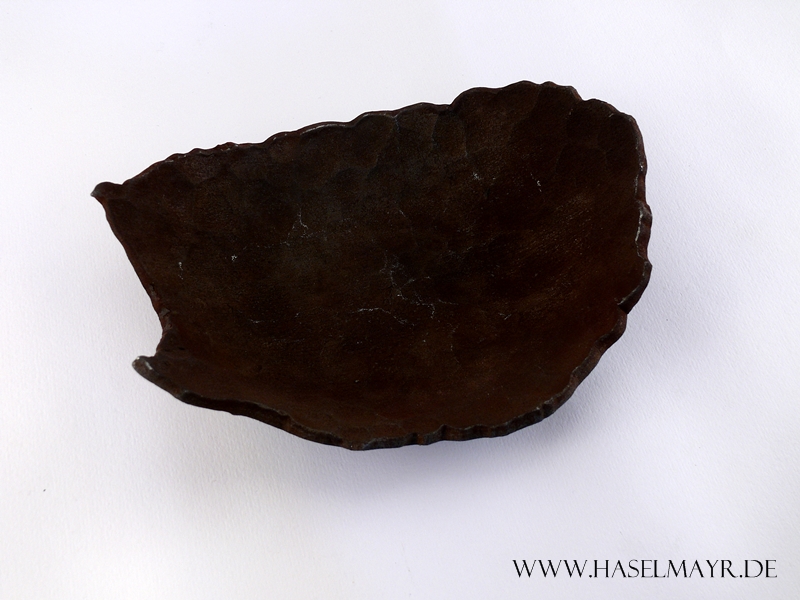 Aus einem einzigen Stück Eisen wird diese Schale in reiner Handarbeit geschmiedet und in Form getrieben, sodass sich eine unverkennbare Oberflächenstruktur bildet.