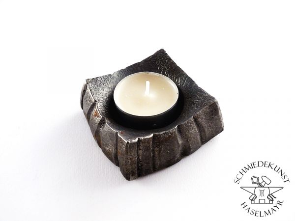 Dieser Teelichthalter besteht aus massivem Eisen und ist handgeschmiedet.