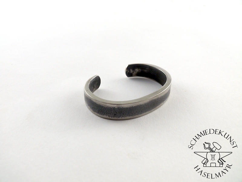 Wir fertigen diese Armreife aus Rein-Titan, also einem Material, das sich durch antiallergene Eigenschaften auszeichnet. Es wird häufig auch für medizinische Imnplantate eingesetzt. Durch die Materialeigenschaften und die Verarbeitung entsteht ein relativ leichtes (Die Dichte von Titan ist etwa halb so groß, wie die von Stahl) und dennoch hochfestes und dekoratives Schmuckstück.