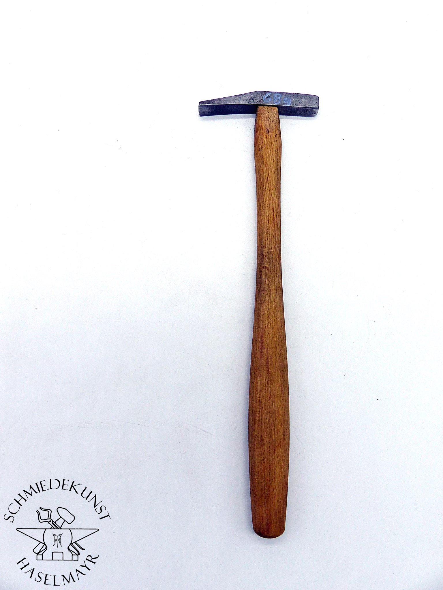 Gebrauchter Hammer aus einer aufgelösten Gesenkschmiede. Oberfläche altersbedingt angelaufen, Hammerbahn spiegelpoliert. Der Hammer ist sauber eingestielt und am Auge verschraubt.