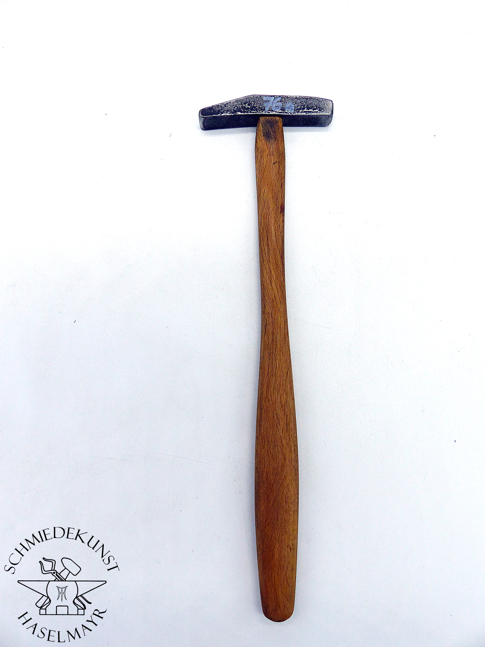 Gebrauchter Hammer aus einer aufgelösten Gesenkschmiede. Oberfläche altersbedingt angelaufen, Hammerbahn spiegelpoliert. Der Hammer ist sauber eingestielt und am Auge verschraubt.