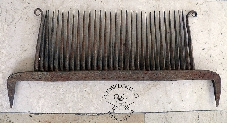 Altes Original eines großen Flachsrechens mit natürlicher Rostpatina.
